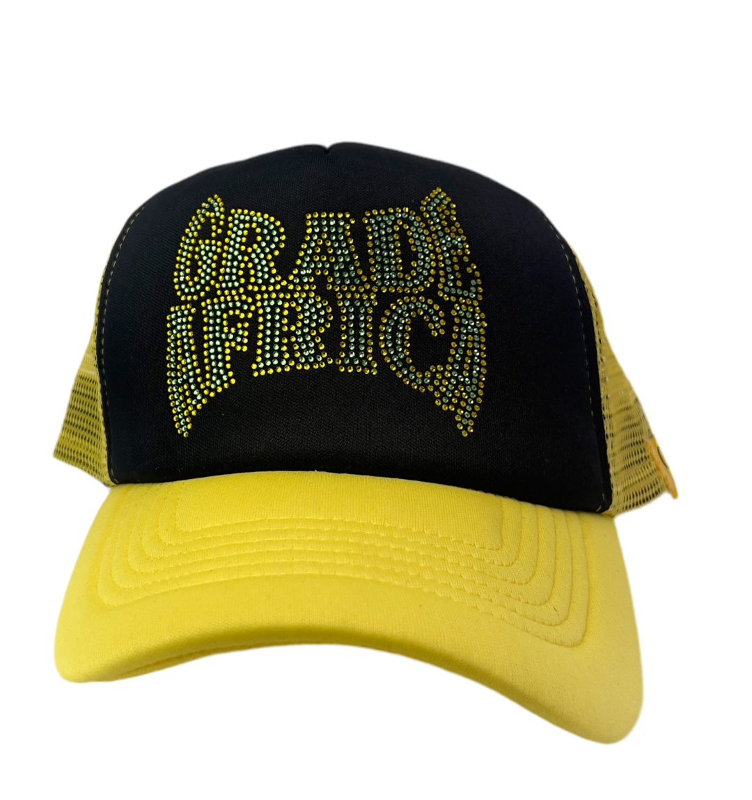 Trucker hat adorned with vibrant yellow and green stones, adding a pop of Colour and personality to any outfit. The stones' earthy tones evoke feelings of nature and serenity, while the trucker hat's classic design provides a stylish and comfortable fit."